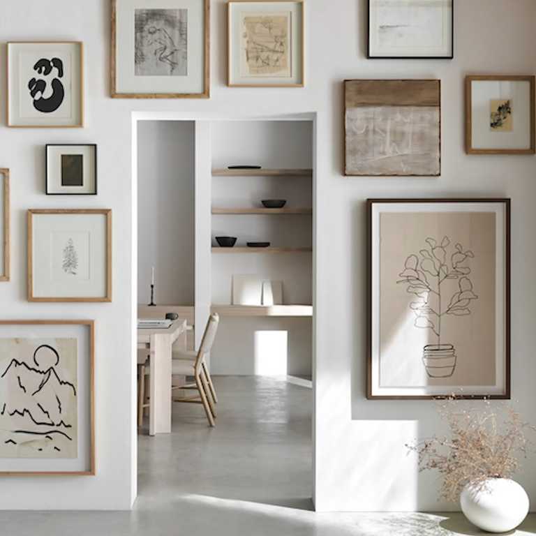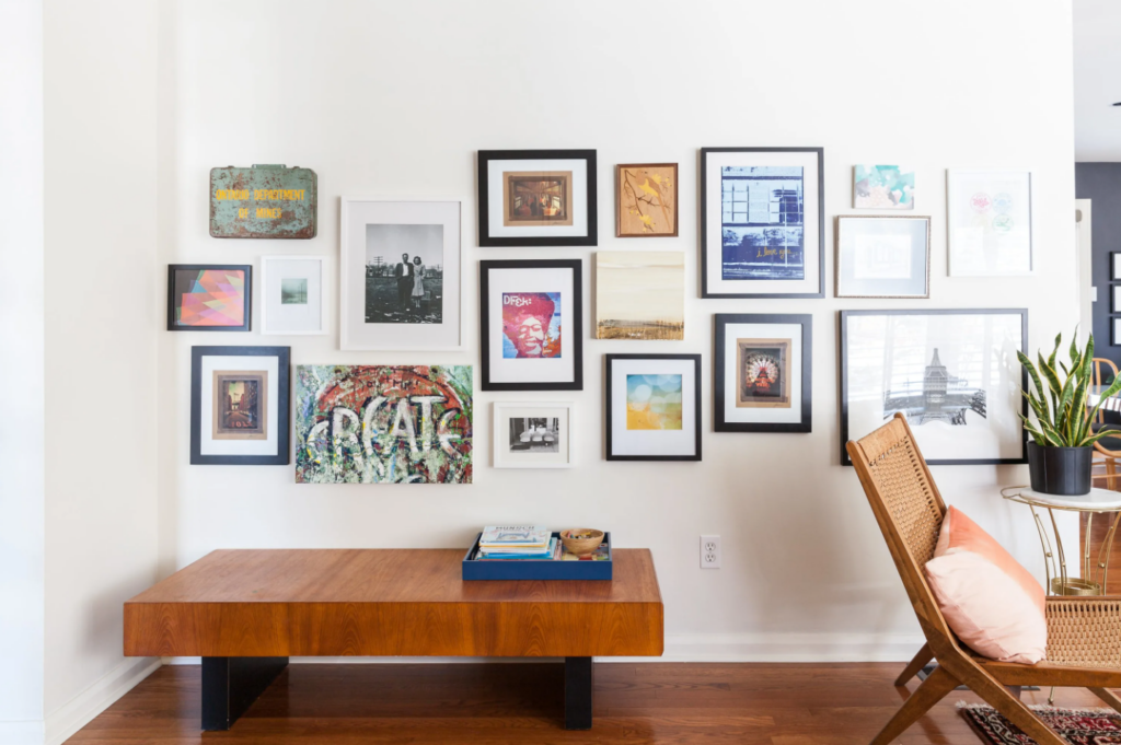 A gallery wall is a curated display of photos, posters, or prints, creatively arranged on a wall with pictur …
